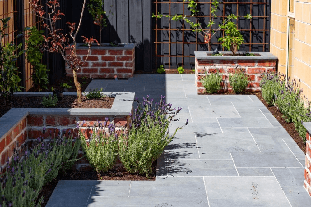 7. Choosing Too Many Different Materials. A common landscape design mistake is not choosing materials like pavers that are consistent with a cohesive theme. Using too many different materials or materials that do not coordinate makes the space look like it was pieced together with no intention or plan. This makes the space feel busy and smaller than it actually is. This can also occur when too much variation is used in plant selection. For this reason, mass planting often has a better visual effect. In the photo below, the brick and pavers become visually cohesive through the use of the same colour grout between the red bricks and the bluestone pavers, along with a single planting (lavender) for the border that prevents the space from looking too busy.