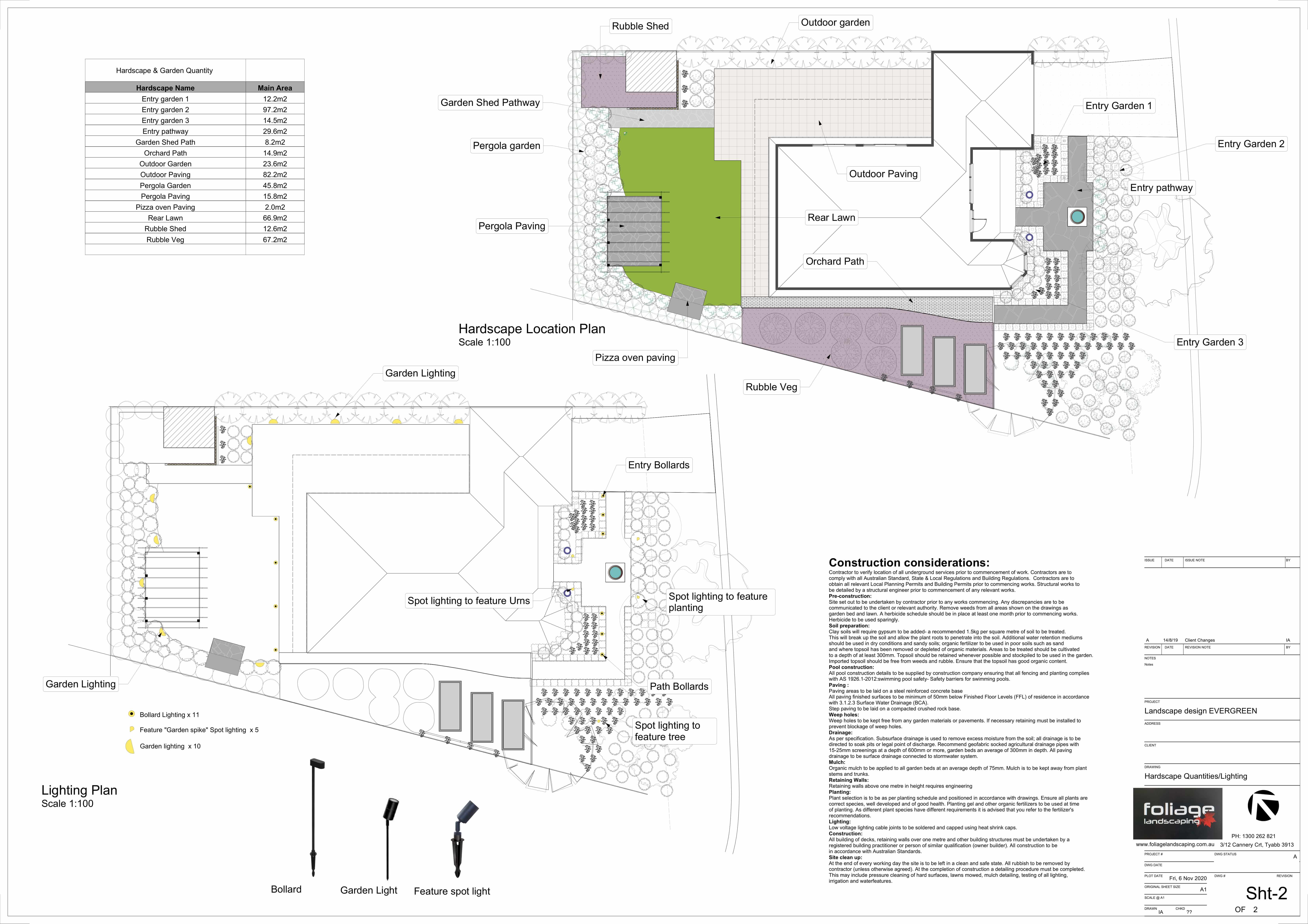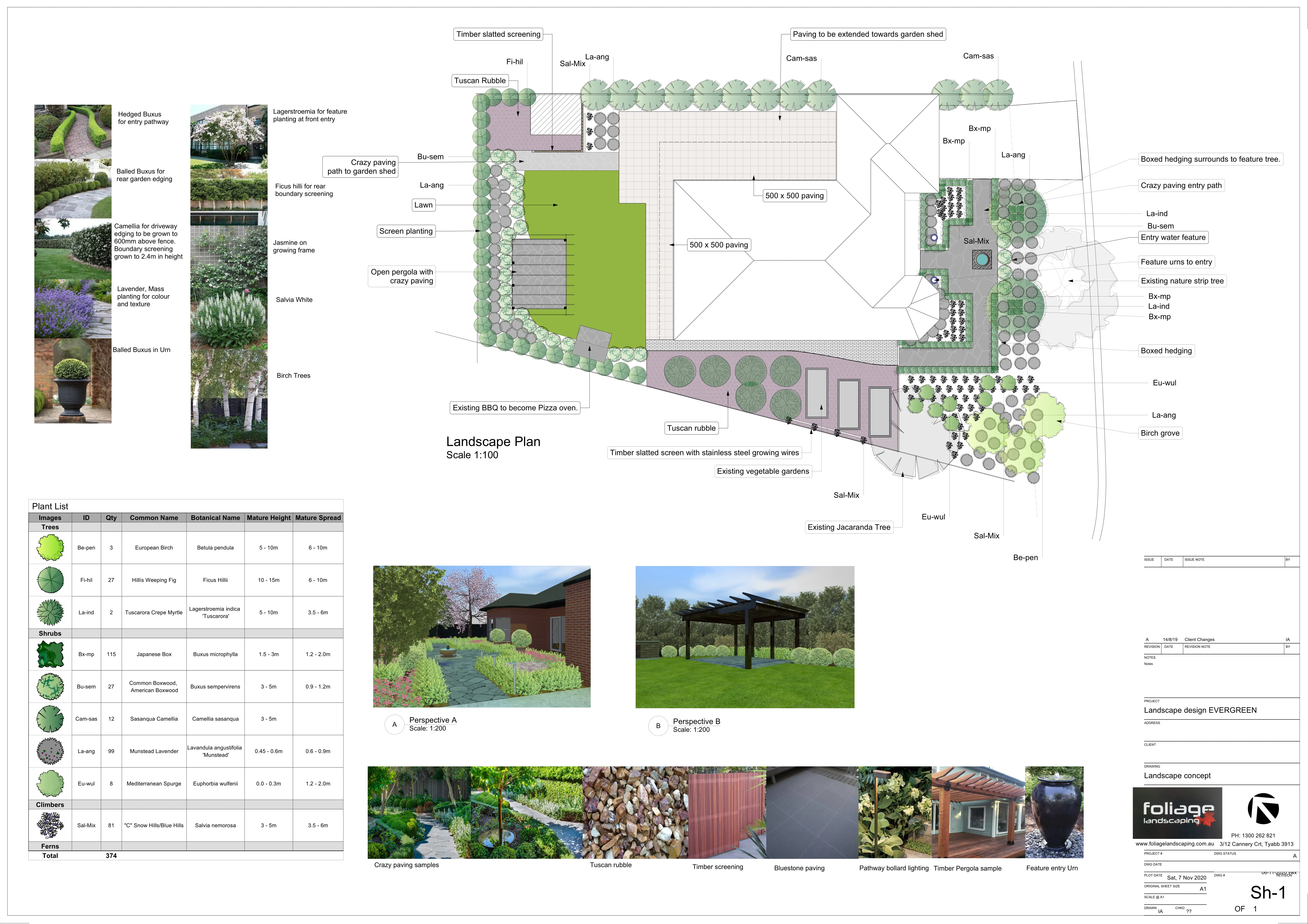 Our Evergreen Design is a full plan representation of the areas that are to be landscaped. This package includes all elements of the Design including a detailed plant schedule with plant names, quantities and pot sizes, hardscape material schedules such as paving, decking and wall treatments, precise layouts of all hard and soft landscape areas of the proposed garden including locations of relevant components such as swimming pools, paving, driveways, pathways, garden beds, lawn areas, and outdoor lighting plan and quantities.