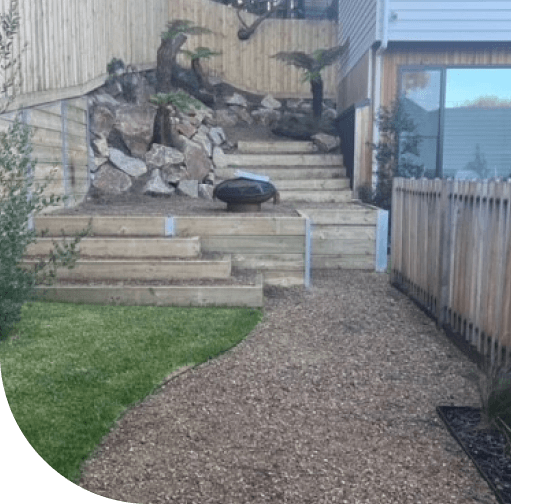 Our team encountered tight access limitations, with only 900mm of space through the garage’s pedestrian door. We overcame this significant logistical challenge by using a small excavator to clear the rubble and shape the backyard. However, all debris had to be manually transported by wheelbarrow to protect the garage entrance from damage. Through creative problem-solving, our team effectively maneuvered the steep slope with minimal disruption to the existing retaining walls, natural rocks, and imposing boundary fencing. We carefully planned and coordinated our work to ensure that all materials and equipment were moved by hand in the confined space.
