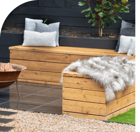 The side of the house presented a challenge with overlooking issues and a steep staircase. We screened the neighbour with trees to create a green screen. We used large format bluestone pavers as steppers to the side to connect with the backyard. A transition from inside to outside was created with new bi-fold doors. An existing concrete pad was extended and paved with bluestone. Connection to a firepit area is via large format bluestone pavers on a crushed rock and mortar base and finished off with a decorate topping/pebble. The firepit area is framed with a mesh growing frame and planted with climbing Jasmine. The firepit sets were custom built to fit the area and constructed in cypress for longevity. The backdrop of Teddy Bear Magnolias is enhanced by painting the existing fence and retaining wall in black. The synthetic turf is a useful area for sitting and somewhere for kids to play.